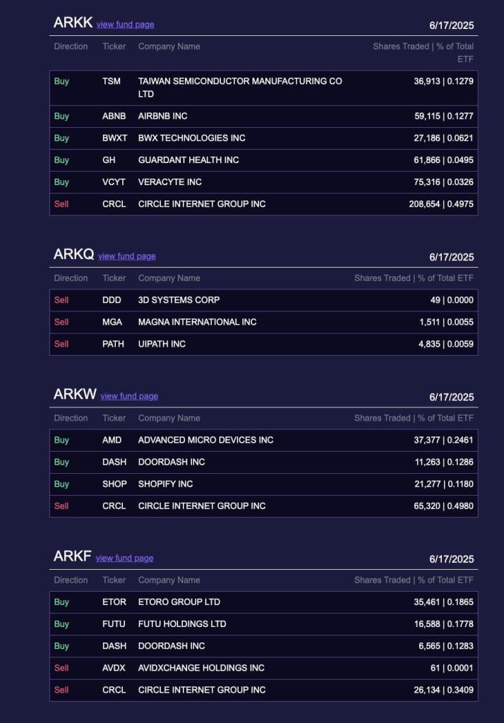 Ark Invest funds trade on June 17, 2025 (Source: X/Ark Invest Daily)