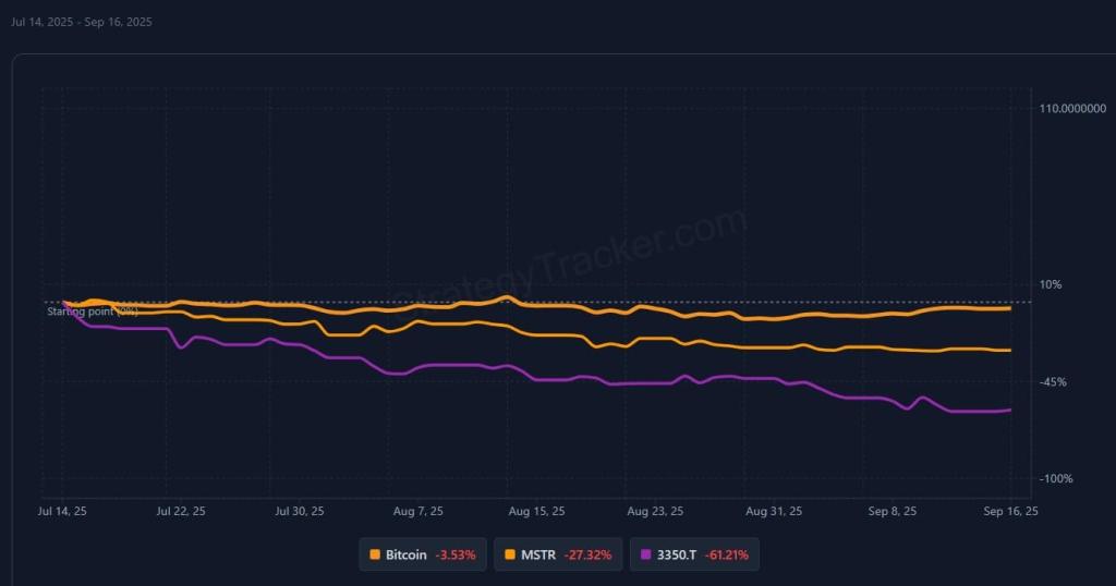 Strategy and Metaplanet Stock Performance vs Bitcoin Since July 14 (Source: Strategy Tracker)