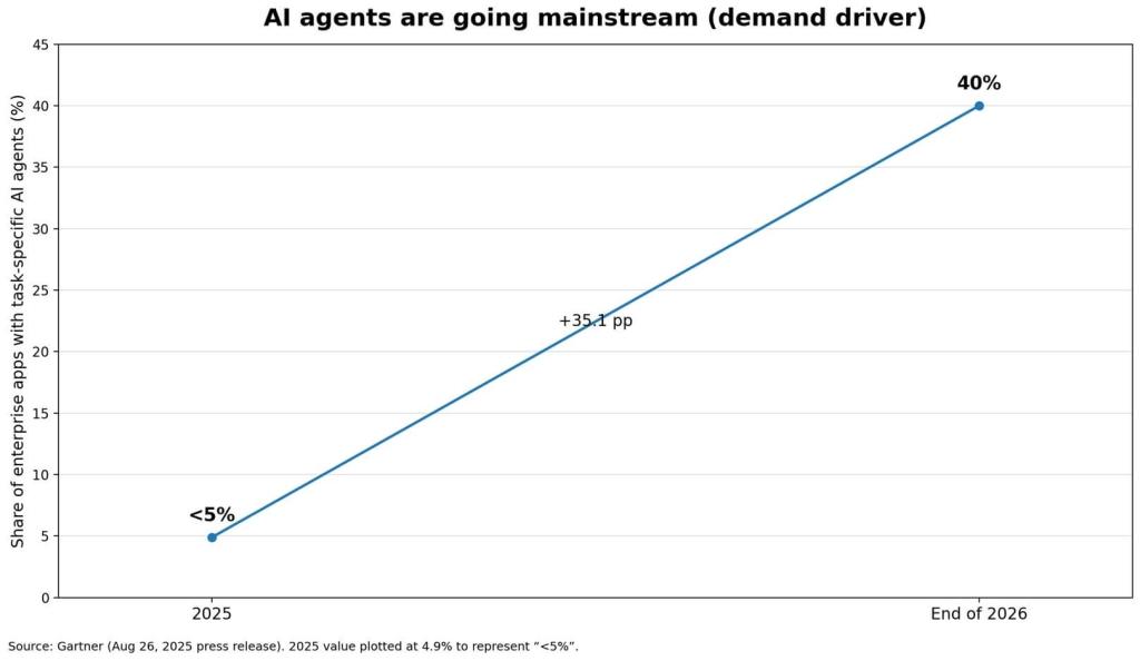 Gartner forecasts enterprise applications with task-specific AI agents will jump from under 5% in 2025 to 40% by end of 2026.